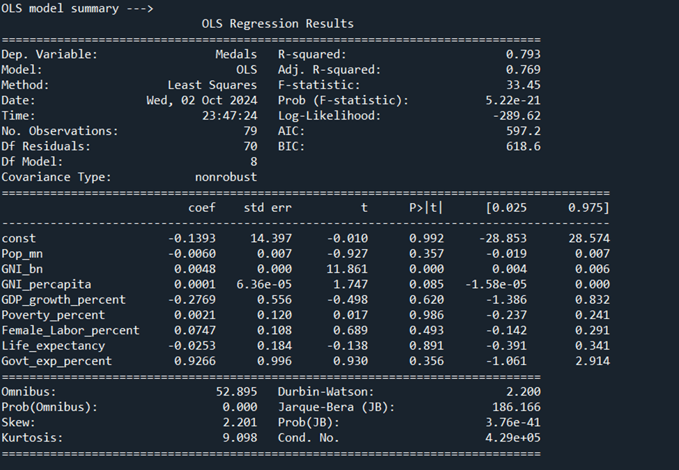 Two runs of the models were performed – including countries with 0 medals, and excluding countries with zero medals; summary of which is presented below.