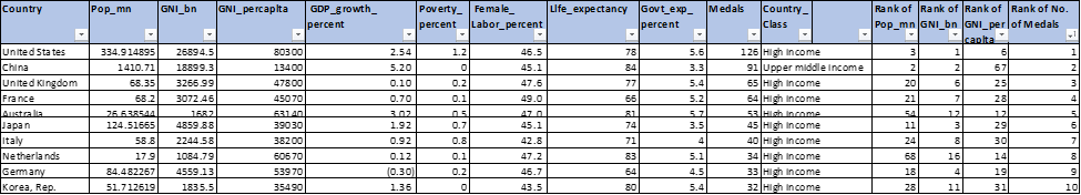 | Pearson correlation (top 3 variables with highest correlation to medals tally) | GNI, Population, GNI per capita | GNI, Population, GNI per capita |